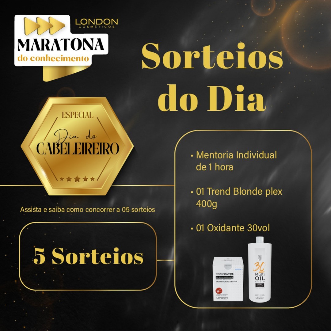 Cada dia trará insights valiosos com os melhores profissionais do mercado. Não perca esta chance de aprender e concorrer a prêmios diários, além de um mega sorteio no dia 19/01, Dia do Cabeleireiro, de um voucher de R$2.000,00 em produtos da London Cosméticos. Confira os prêmios que você pode faturar em cada um dos dias da Maratona: